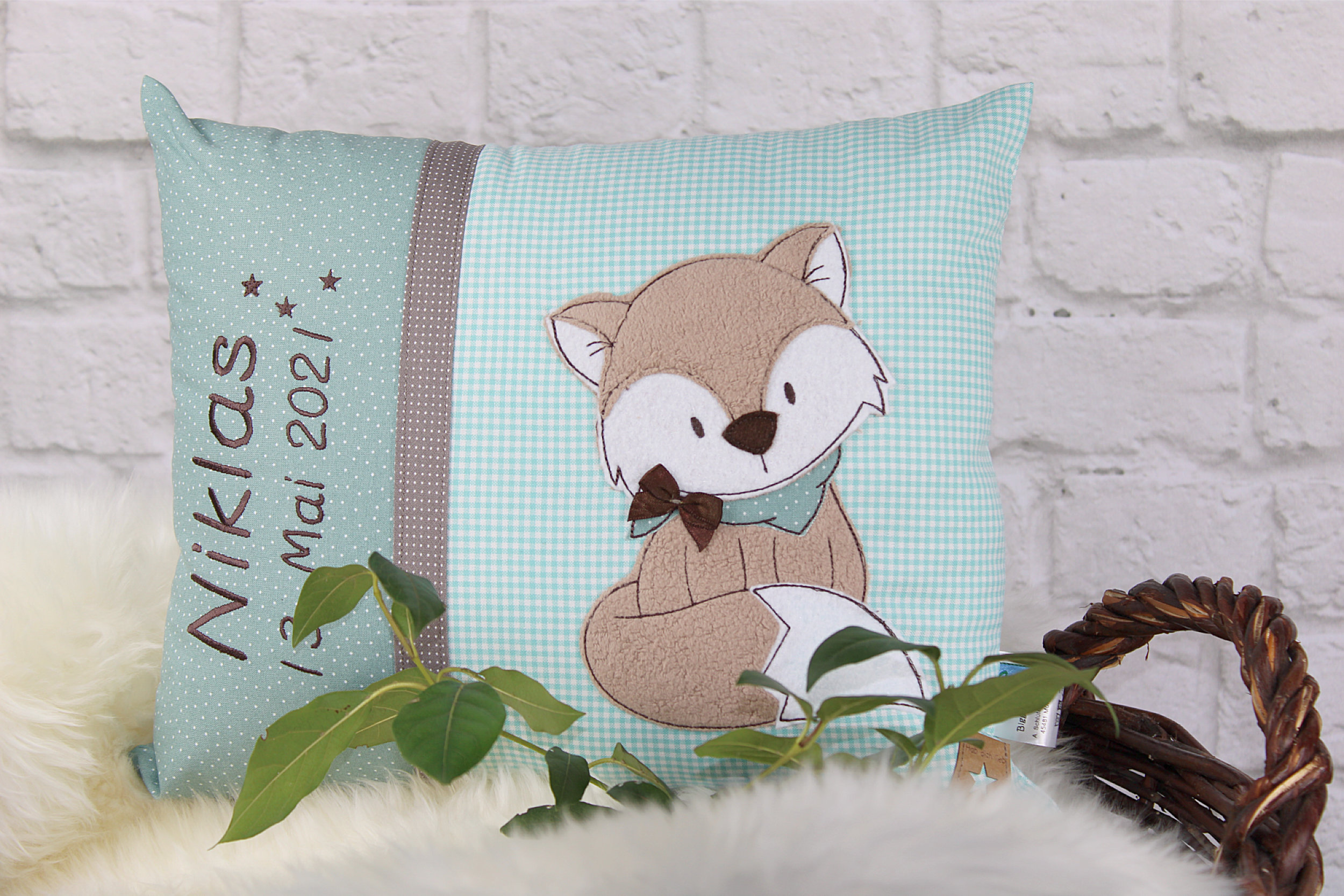 Published 14. Mai 2021 at 2500 × 1667 in Namenskissen-Fuchs-gruen-mint-biggisdesign-1.